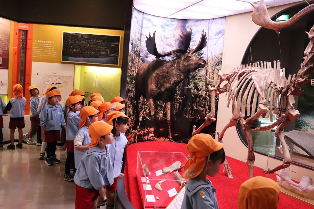 職員さんから話を聞き、中に入ると…まずは大きな恐竜がお出迎えしてくれました。子ども達はその大きさに圧倒され、「おおきーい!」と歓声が!