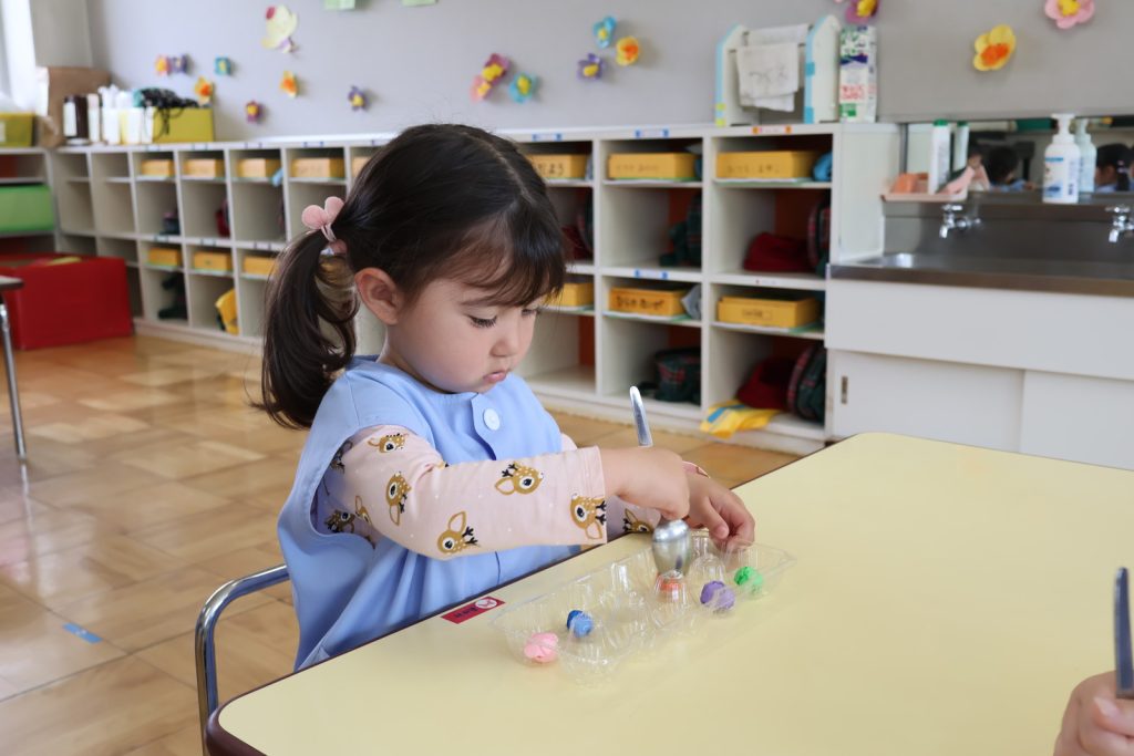 卵パックに手を添えて、上手にカラーボールをすくいあげることができました。