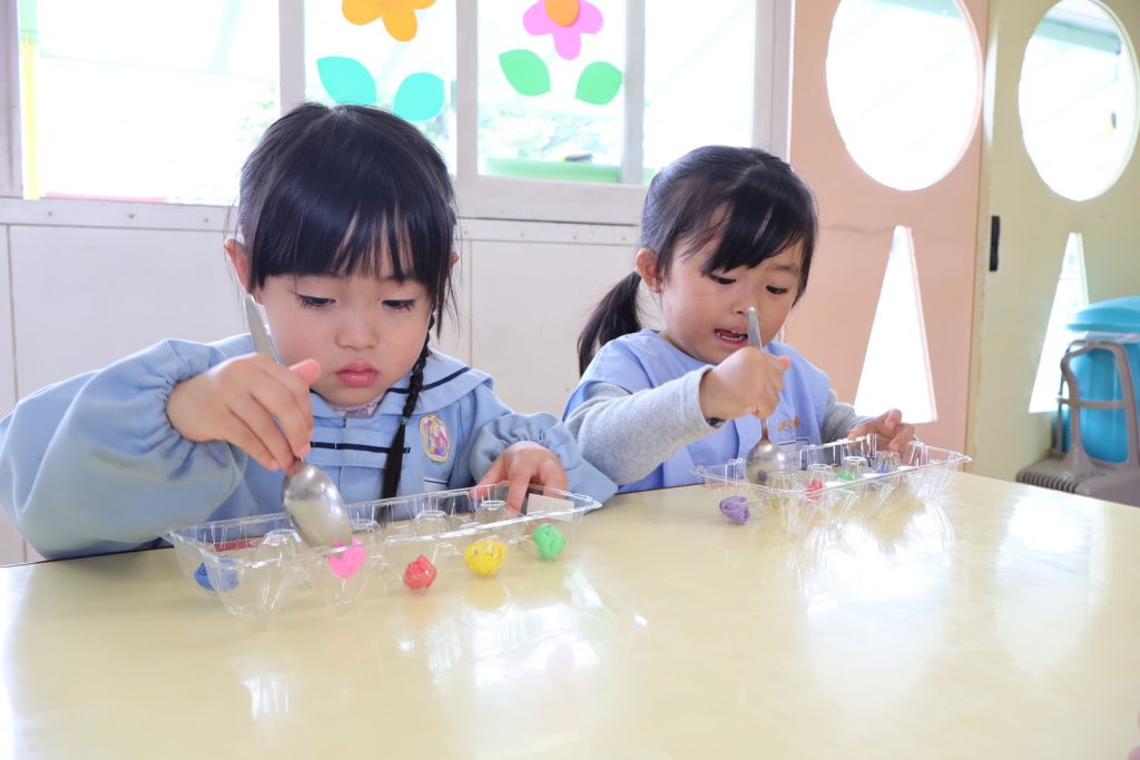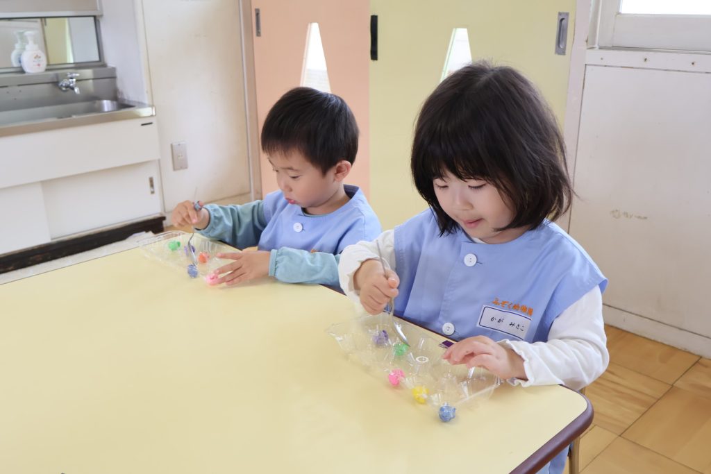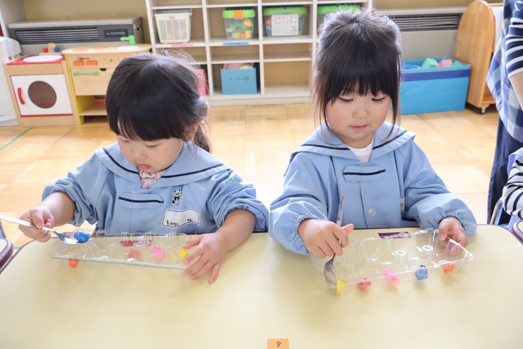 そのあと、卵パックにいれたカラーボールを移動させるゲームを行いました。😊