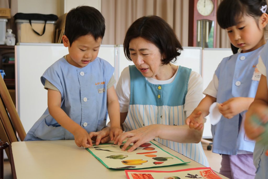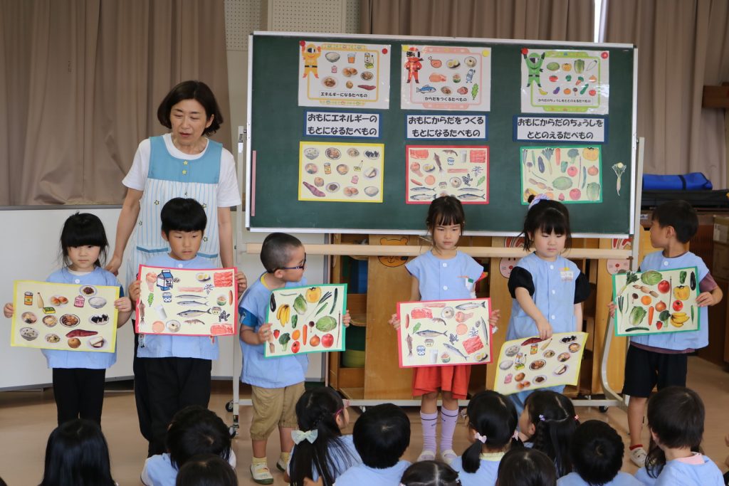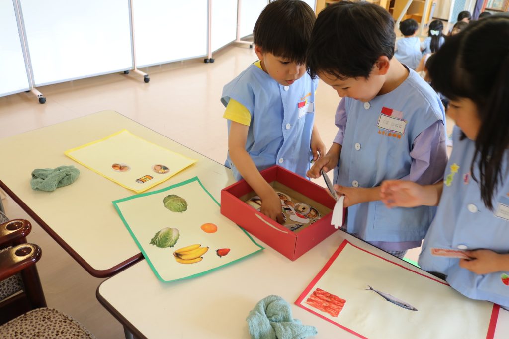 年長組が食育に参加しました。3つの食品群『からだをつくるもの』『エネルギーになるもの』『からだの調子をととのえるもの』を教えてもらい、子ども達は一人ずつどの食品群にあてはまるかを楽しく分けました♪